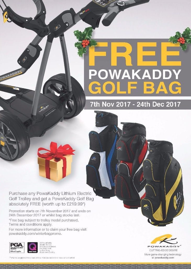 Once you have purchased a Powakaddy Lithium Trolley from Express Golf either online or in-store you can redeem your Free Powakaddy Bag online at www.powakaddy.co.uk/2017xmasbagpromo/