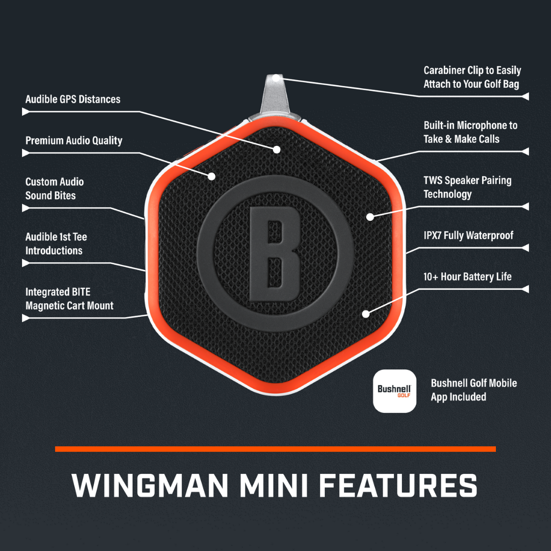 The new Bushnell Wingman Mini features amazing sound quality to play your music through whilst on the course. Hit the B button on the Wingman Mini for Front, Middle and Back distances called out tp you through the speaker. Wingman Mini features Bushnell’s franchise feature BITE magnetic mount that allows you to easily mount the Wingman Mini right on the cart bar.