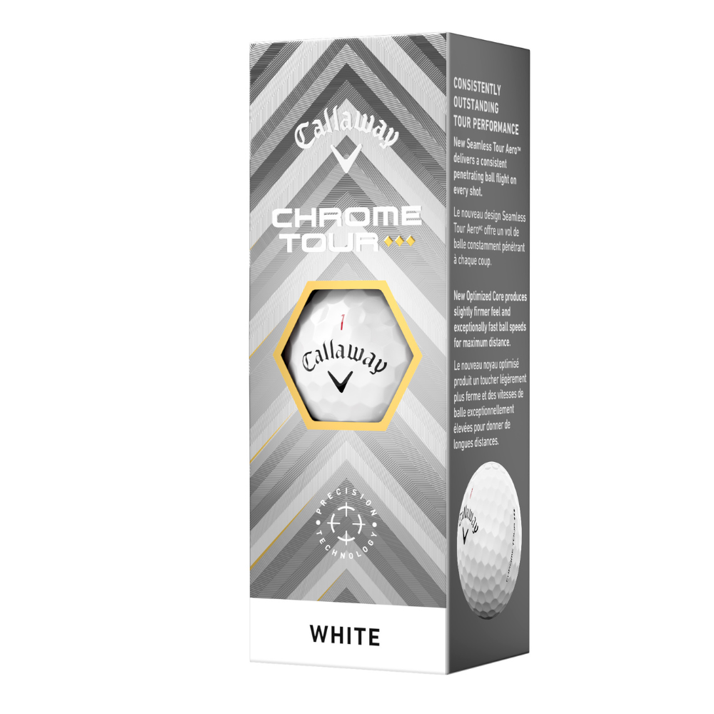 The high-performance Tour Urethane cover is designed to produce a higher launch with lower spin on full shots, while offering Tour-level greenside control for precision and finesse around the green. Engineered with precision technology, every detail of the Chrome Tour ♦♦♦ is meticulously crafted to ensure maximum performance throughout your game. Experience the perfect blend of power, feel, and control with a ball that’s built for peak performance.