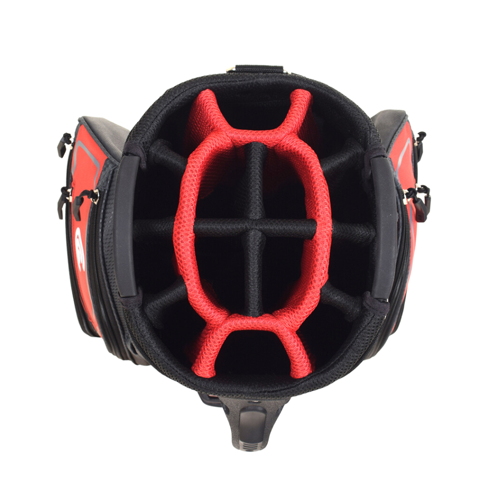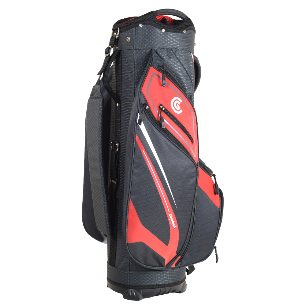 Cleveland Friday lightweight cart bag features a 14 way top divider system with full length dividers, 8 pockets for all your golfing equipment including a velour lined valuables pocket and insulated cooler pocket.