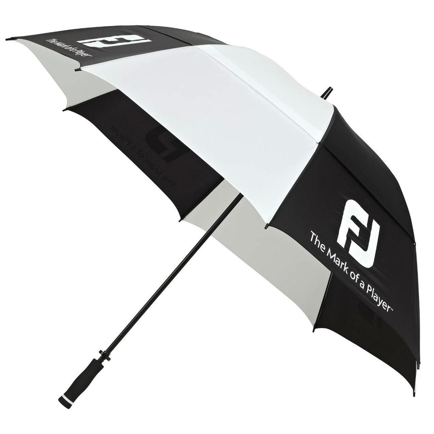A huge black and white golf umbrella with FootJoy logo. Features a double canopy for use in windy conditions.