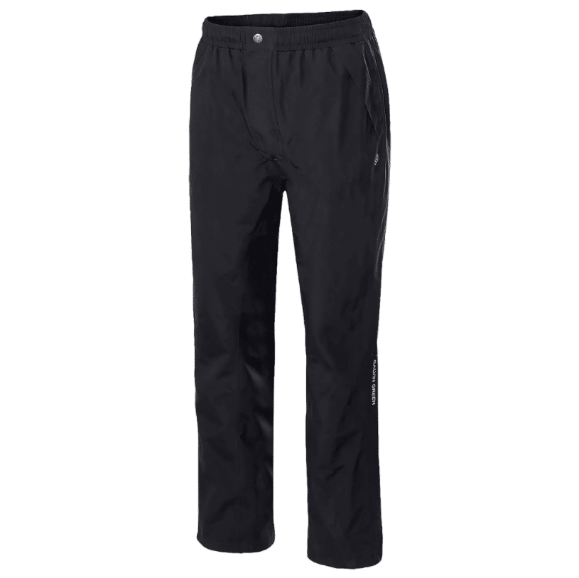 The top-selling premium waterproof trousers. Crafted in GORE-TEX® fabric with a solid lining. Elasticated waistline with zip fly opening and drawstring positioned at the back. Fleece-lined front pockets and single back pocket with branded panel. Inner leg seam strengthened by clever design and reinforced fabric used on the bottom edge for exceptional durability. Long zip openings on each leg and all zips protected by a panel. Available in Black in 25 sizes to please every serious golfer.