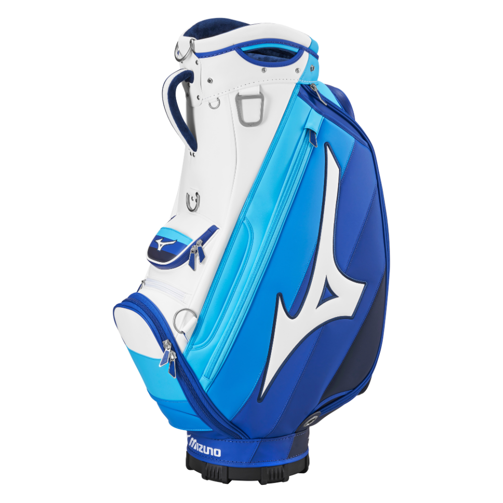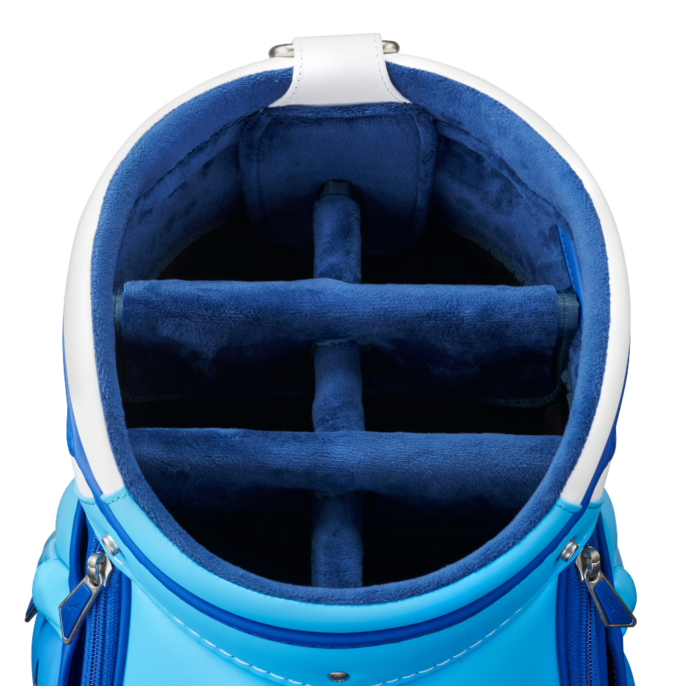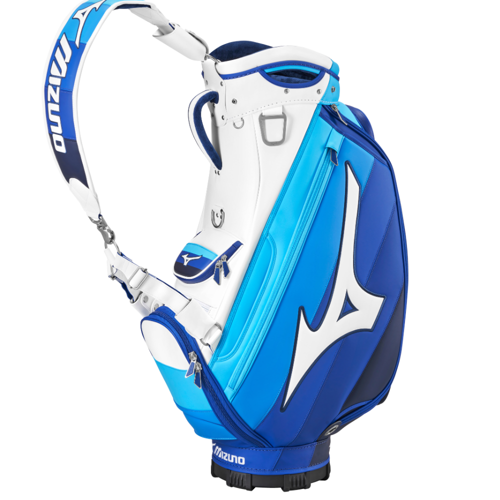 Mizuno Tour Staff Bag – A true classic, the Tour Staff Bag returns to its roots with Mizuno’s signature two-tone blue trim and premium tour-grade construction. This is the exact model used by Mizuno’s contracted professionals worldwide, built to endure the demands of a full season on tour. Designed with premium details, it features a molded 6-way top cuff with side grab handles, two insulated drink pockets, a waterproof fleece-lined valuables pocket, a magnetic accessories pocket, and a zip-off panel for custom embroidery. Experience tour-level quality and performance with every round.