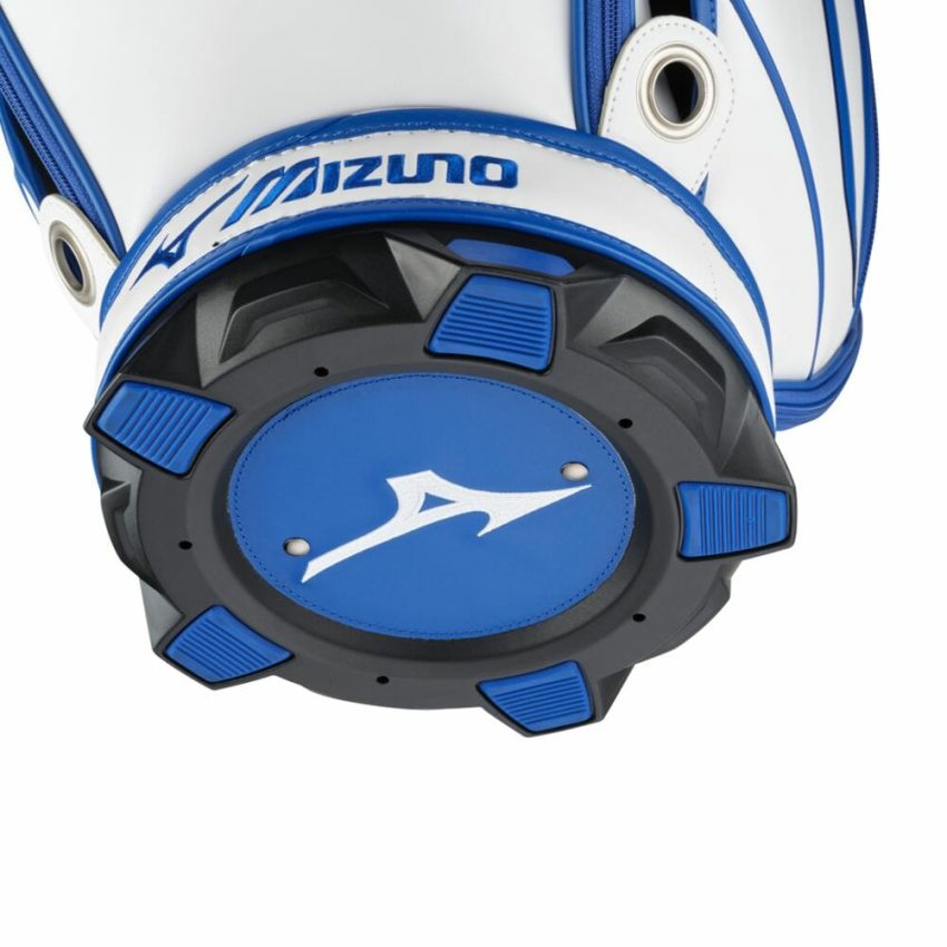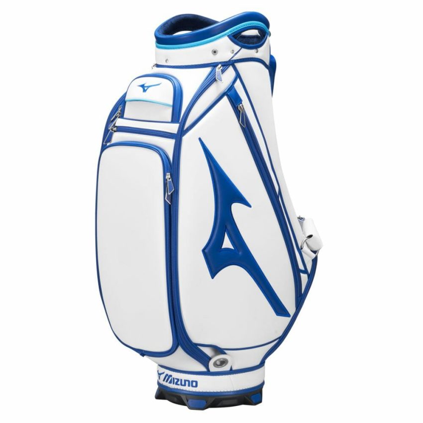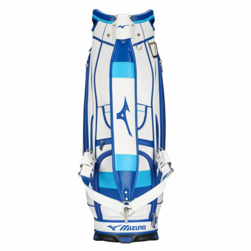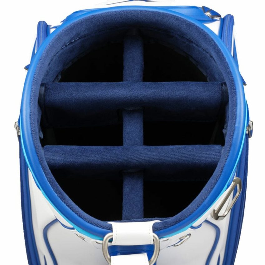 Mizuno Tour Staff Bag – A true classic, the Tour Staff Bag returns to its roots with Mizuno’s signature two-tone blue trim and premium tour-grade construction. This is the exact model used by Mizuno’s contracted professionals worldwide, built to endure the demands of a full season on tour. Designed with premium details, it features a molded 6-way top cuff with side grab handles, two insulated drink pockets, a waterproof fleece-lined valuables pocket, a magnetic accessories pocket, and a zip-off panel for custom embroidery. Experience tour-level quality and performance with every round.