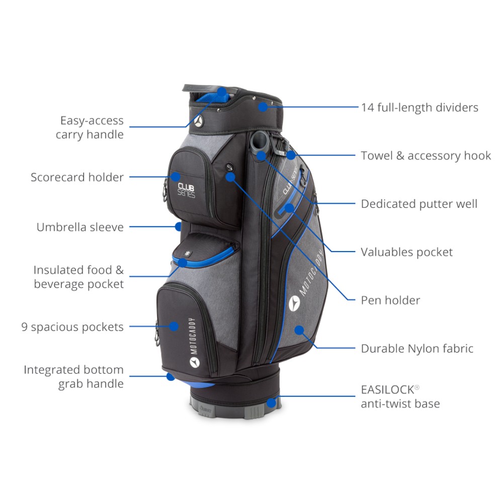 The newly introduced Motocaddy Club-Series bag strikes a perfect balance between lightweight design and durability, offering an excellent blend of value and style. Boasting nine generously sized pockets, 14 full-length dividers, an external umbrella holder, and a dedicated putter well, this bag is crafted from durable Nylon fabric for a premium aesthetic and long-lasting performance. Additional features include an accessory hook with a Velcro glove patch, scorecard and pen holders, along with an anti-twist base that seamlessly integrates with the EASILOCK® system.