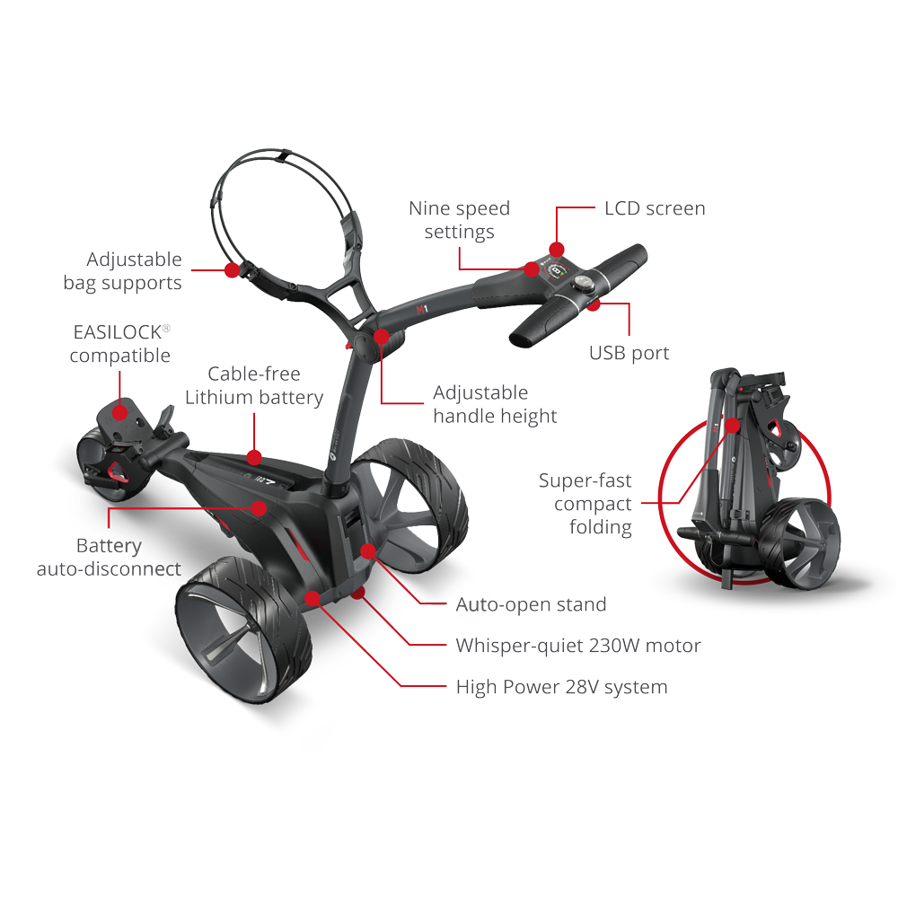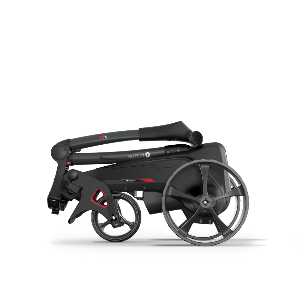 The Motocaddy M1 stands as the world’s easiest-to-use compact trolley, renowned for its straightforward folding mechanism, impressive LCD widescreen display, and nine-speed settings. The latest 2024 model introduces the revolutionary CLICK ‘N’ CONNECT® cable-free battery featuring auto-disconnect and a convenient pop-up charging port. It also showcases automotive-inspired styling, updated ergonomic handle grips, redesigned sporty tires, and compatibility with the innovative M-Series Anti-Tip wheel (Sold separately). With these advancements, the M1 continues to set the standard for user-friendly design, style, and performance in the realm of compact electric trolleys.