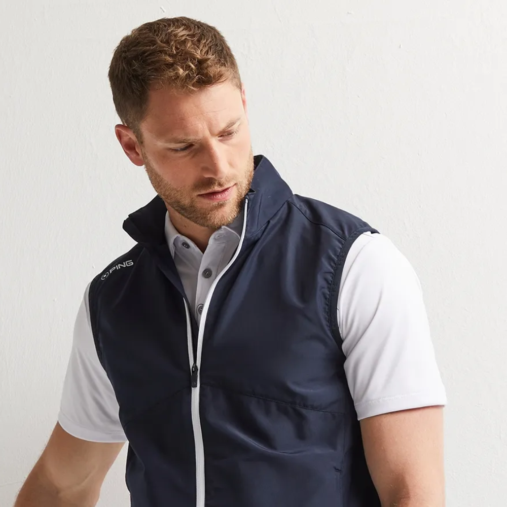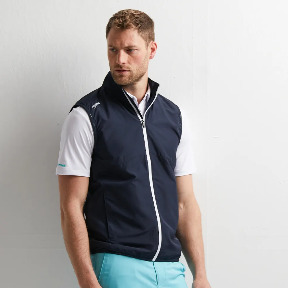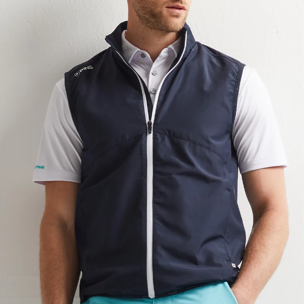 Stay warm and stylish in the men’s Ashbourne Fleece Vest in Navy/Stormcloud. This versatile golf vest is fleece-lined for exceptional comfort and includes two zip pockets for practicality. Designed with PING-branded binding and signature logos, it delivers an athletic yet polished look. A must-have layering piece for both on and off the course.