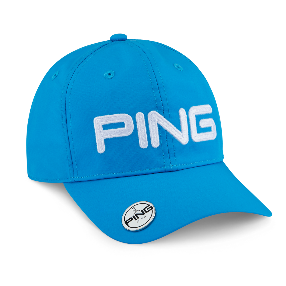 Keep cool and focused with the PING Ball Marker Golf Cap in classic navy. Lightweight and breathable, this cap features a convenient magnetic ball marker on the front peak for quick access during play. The bold PING logo appears on both the front and back, adding signature style. An adjustable snapback closure ensures a comfortable, personalized fit, while the SensorCool® headband delivers advanced moisture-wicking performance to keep you dry in all conditions.