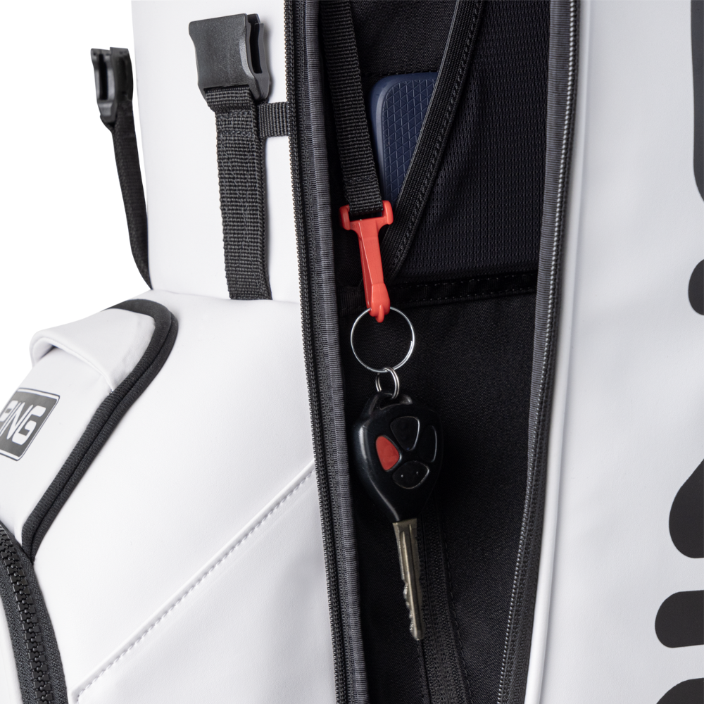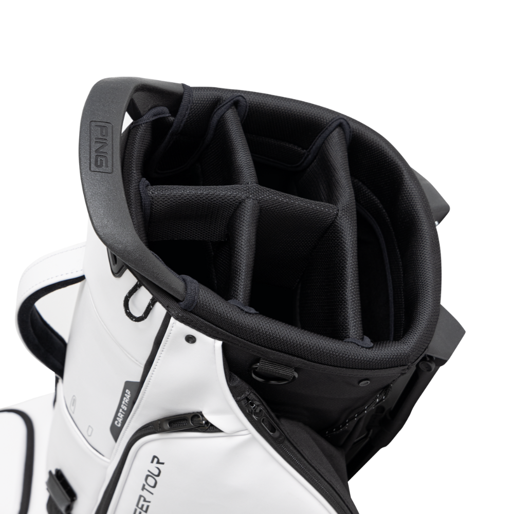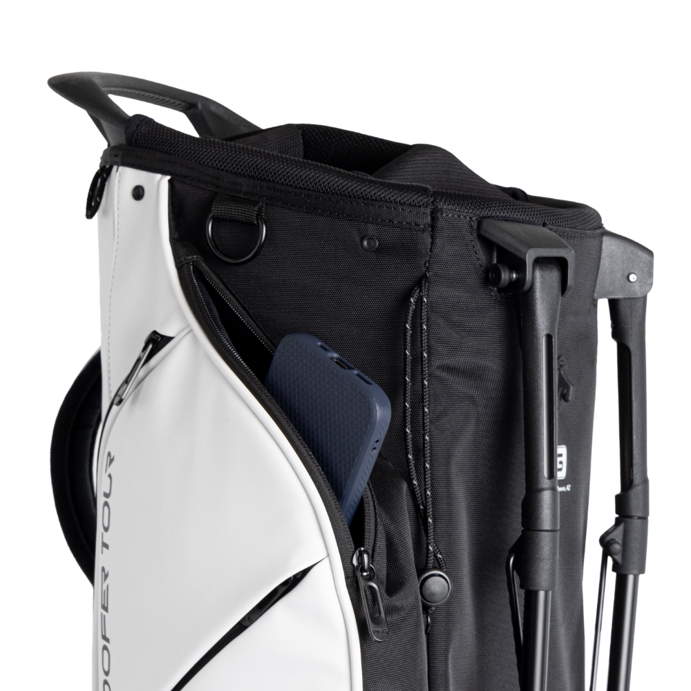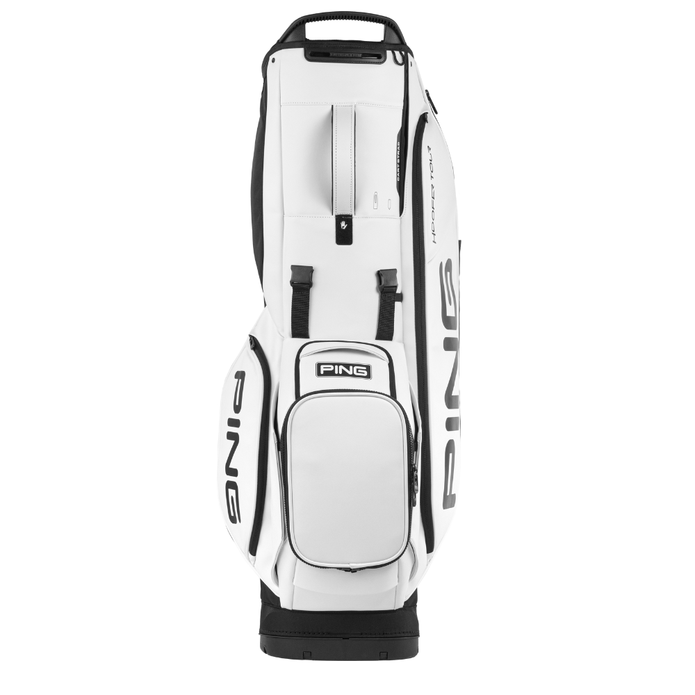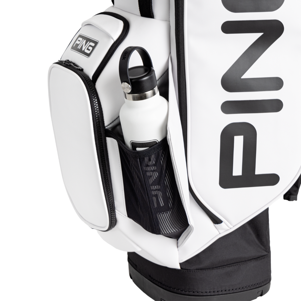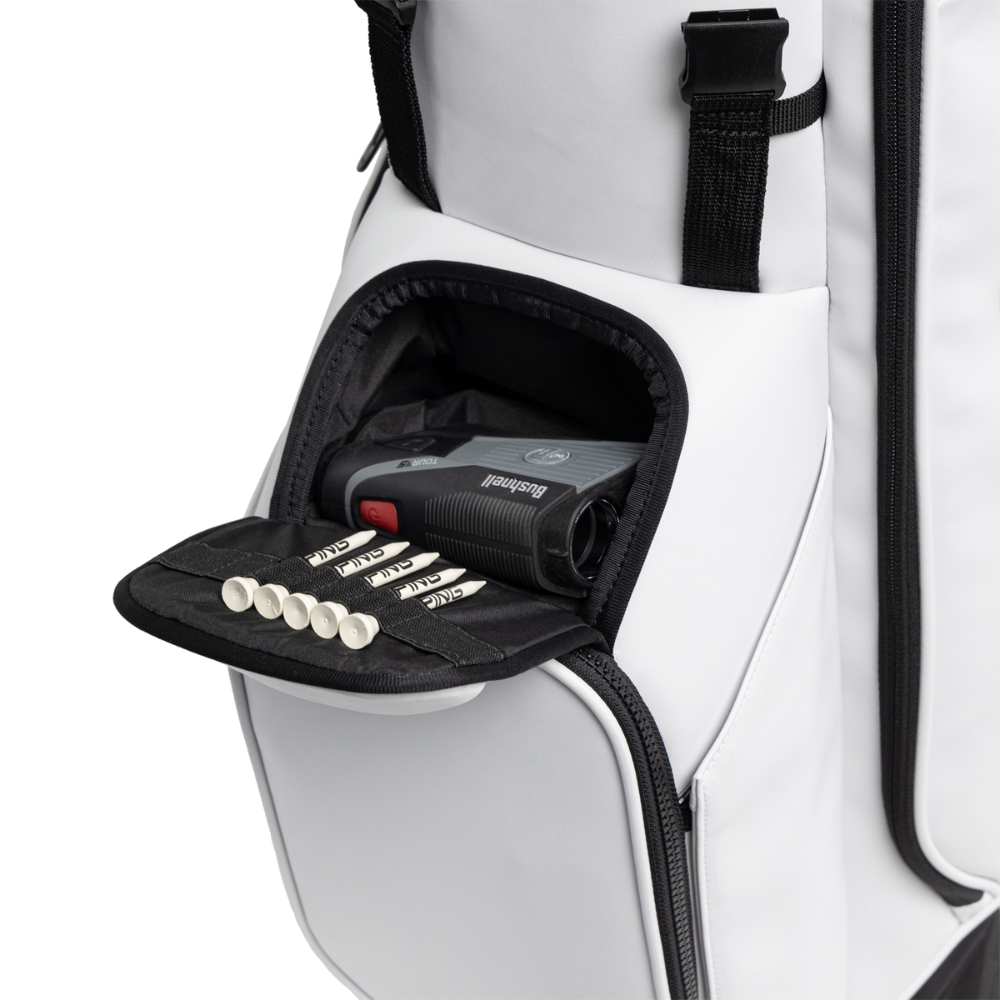 PING Hoofer Tour Golf Bag, a perfect blend of style, functionality, and convenience. Featuring tour-inspired branding, this lightweight bag weighs just 6.2 pounds yet offers a wealth of features to keep you organized on the course. The spacious five-way top ensures easy club management, while 10 thoughtfully designed pockets provide ample storage, including two magnetic water bottle pockets, a magnetic rangefinder pocket, and a full-length apparel pocket. With its sleek design and practical features, the Hoofer Tour is the ultimate companion for any golfer.