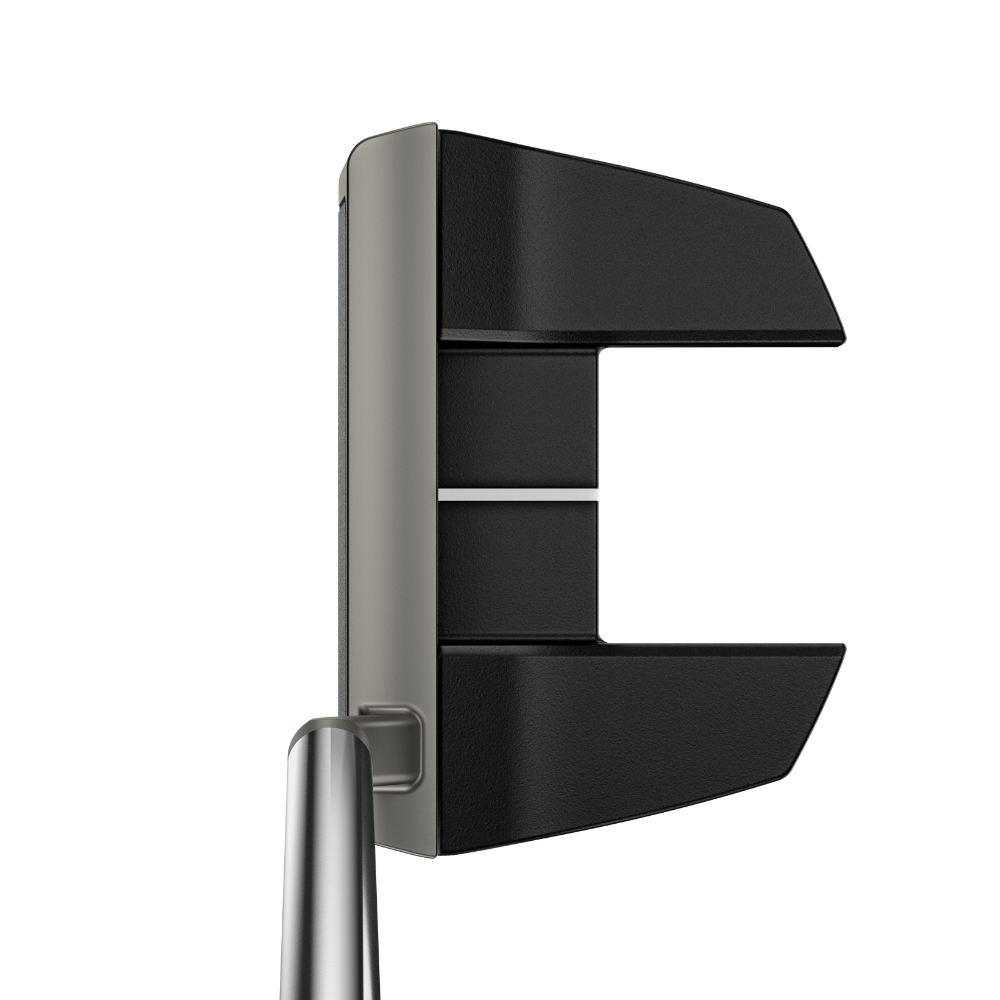 The putters’ aesthetics can also aid performance. At address, subtle colour blocking between the black-nickel top rail and matte-black PVD back portion draw focus to the front for easier alignment.