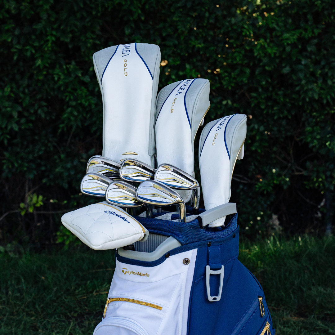 The TaylorMade Kalea Gold Driver is tailored specifically for women, featuring a unique Carbonwood™ construction that enhances launch conditions and forgiveness while showcasing a stunning, premium design.