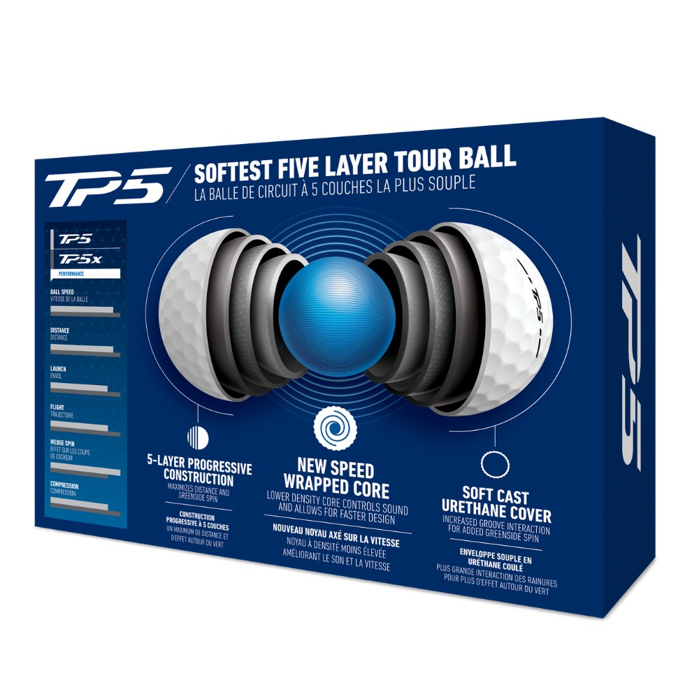 The new TP5 features a new Tour Flight Dimple Pattern which promotes maximum carry distance along with a steep angle of descent for extra stopping power. The TP5 is the softest and highest spinning Tour ball with enhanced stopping power within 100 yards.