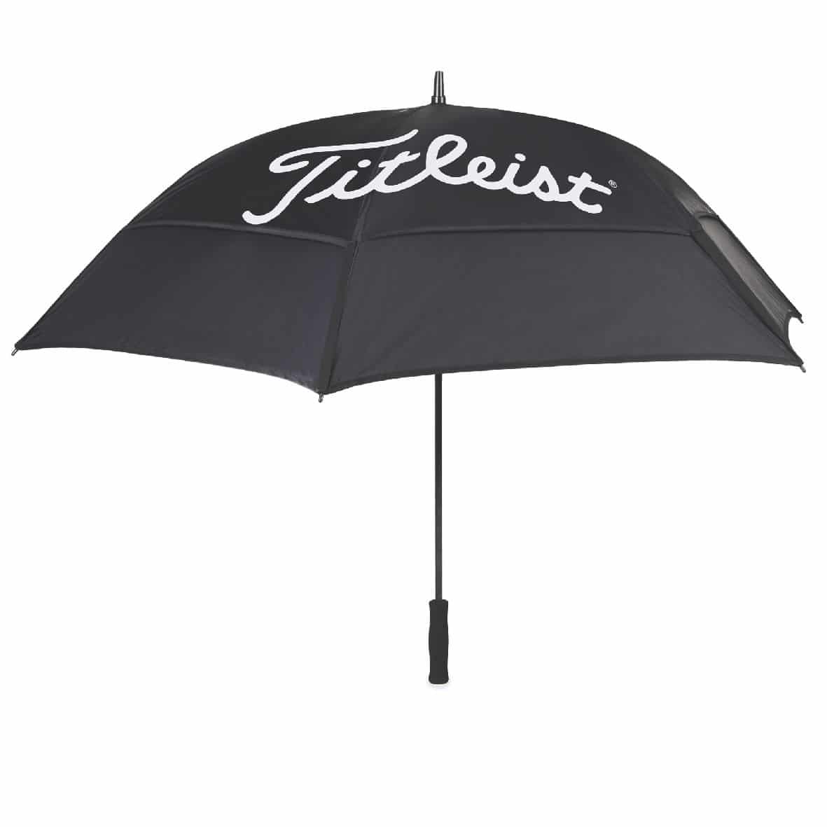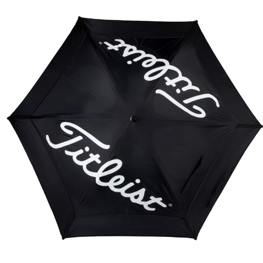 A huge black and white golf umbrella with Titleist logo. Features a double canopy for use in windy conditions.